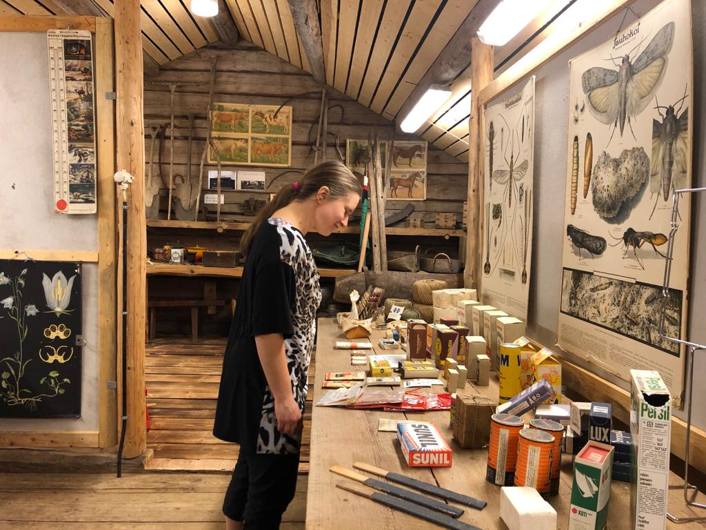 Kuvassa #hiddenaanekoski lähettiläs Olga Kolari tutkii kotiseutumuseon esineistöä.
