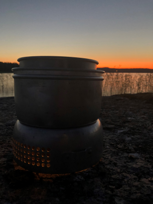Ennen nukkumaanmenoa keitimme trangialla iltateet (metsäpalovaroituksen ollessa voimassa ei nuotiota voinut sytyttää) ja nautimme yhdessäolosta, maisemasta ja veden liplatuksesta.