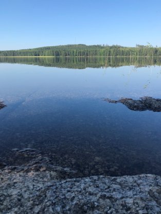 Aamu oli ihanan lämmin ja kaunis, järven selkä oli tyyni.Vielä ennen lähtöä pulahdimme uimaan ja nautittiin kesäsäästä ja kiireettömyydestä. Ennen puoltapäivää soudimme takaisin rantaan (säätiedote lupasi yli 30°c, mikä on järvellä soutaessa suhteellisen lämmin).