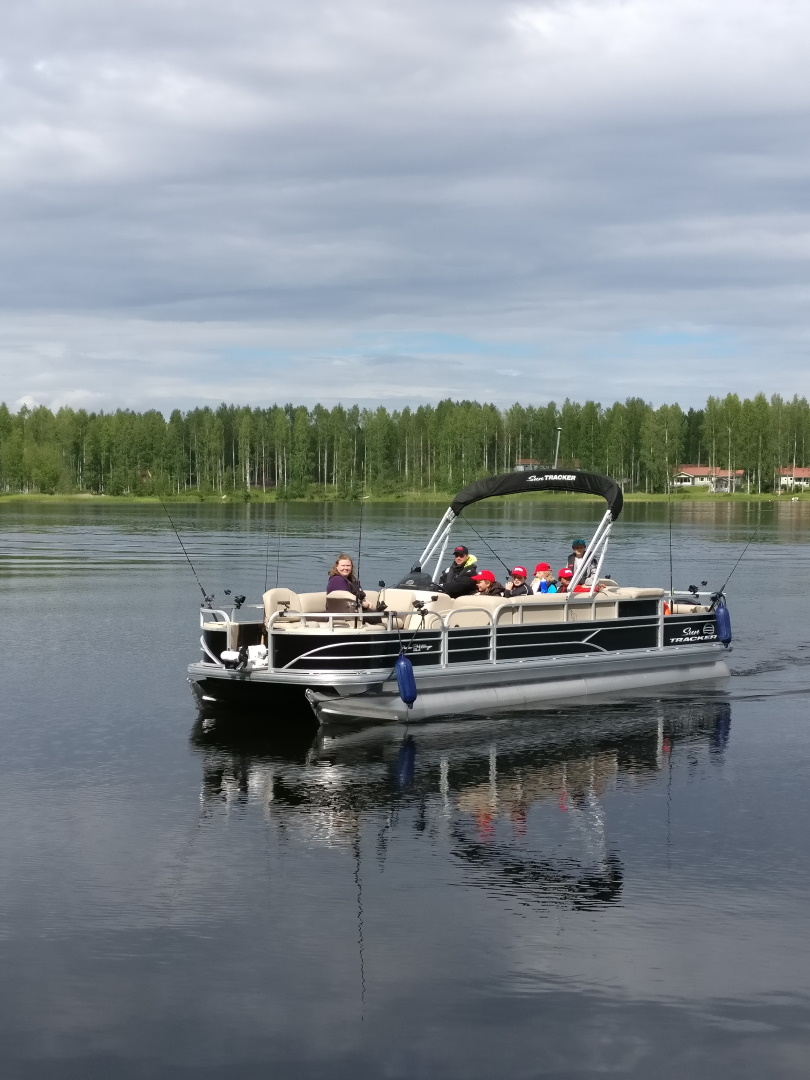 Opasveneen virkaa hoitaa Sun Tracker Fishin Barge 24 Dlx-katamaraani kalastuslautta.
