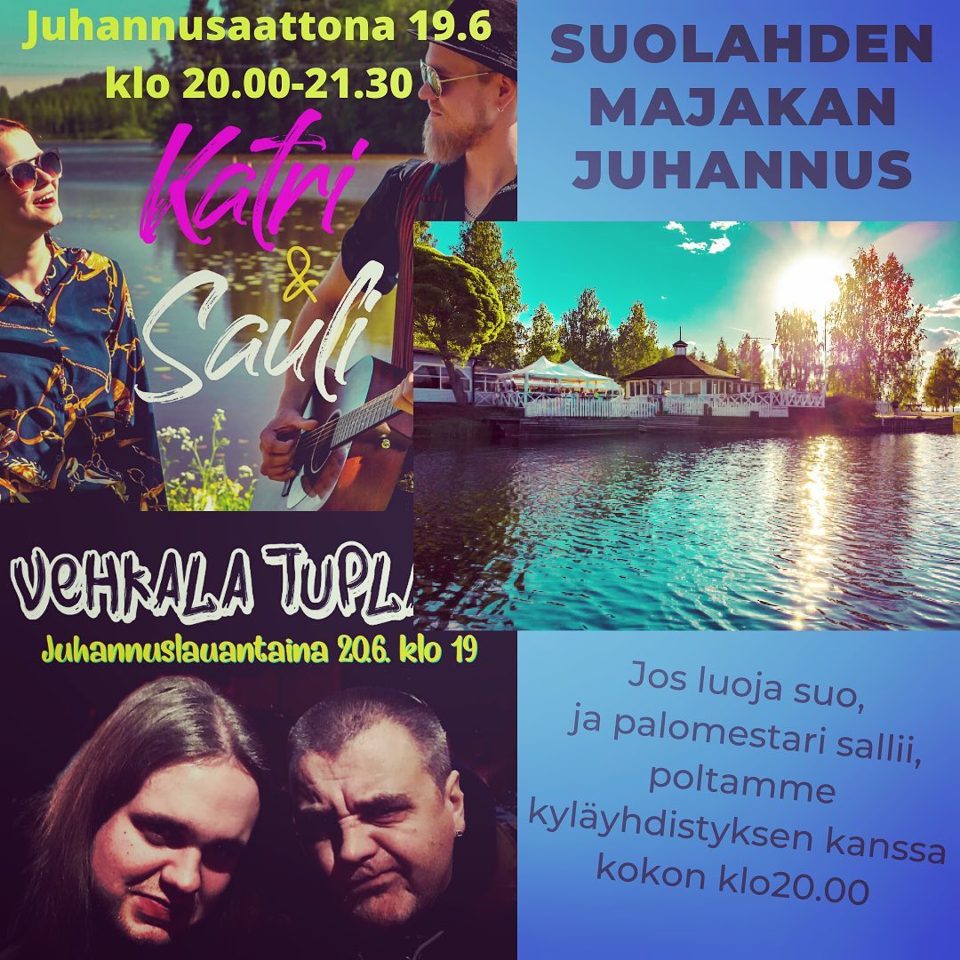 Juhannusaattona 19.6. Majakassa esiintyy Katri ja Sauli kello 20 alkaen. Tapahtumaan on vapaa pääsy. Suolahdessa kokon järjestää ravintola Majakka ja kyläyhdistys yhteisvoimin. Juhannuskokko sytytetään ravintola Majakan läheisyydessä kello 20, jos palomestari antaa siihen luvan.