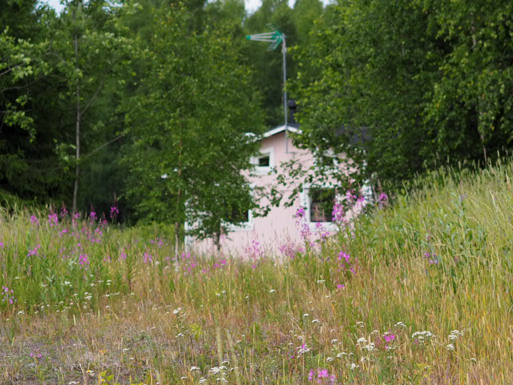 Siirtolapuutarhan parkkipaikalla katse kiinnittyy niittymaisemasta pilkistävään suloiseen vaaleanpunaiseen mökkiin. Mökin omistaa Pohjalaisen perhe, jonka vieraaksi sain kameroineni mennä.