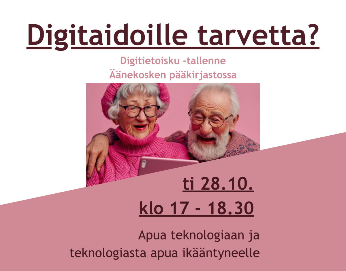 Aiheena tällä kertaa: Apua teknologiaan ja teknologiasta apua ikääntyneelle. Tule kuulemaan millaista apua teknologia voi tuoda ikääntyneen ihmisen arkeen ja miten helpottaa teknologisten laitteiden käyttöä! Asiaan perehdyttää Ikäteknologiakeskuksen erityisasiantuntija Kaisa Huuhtanen, VALLI ry.