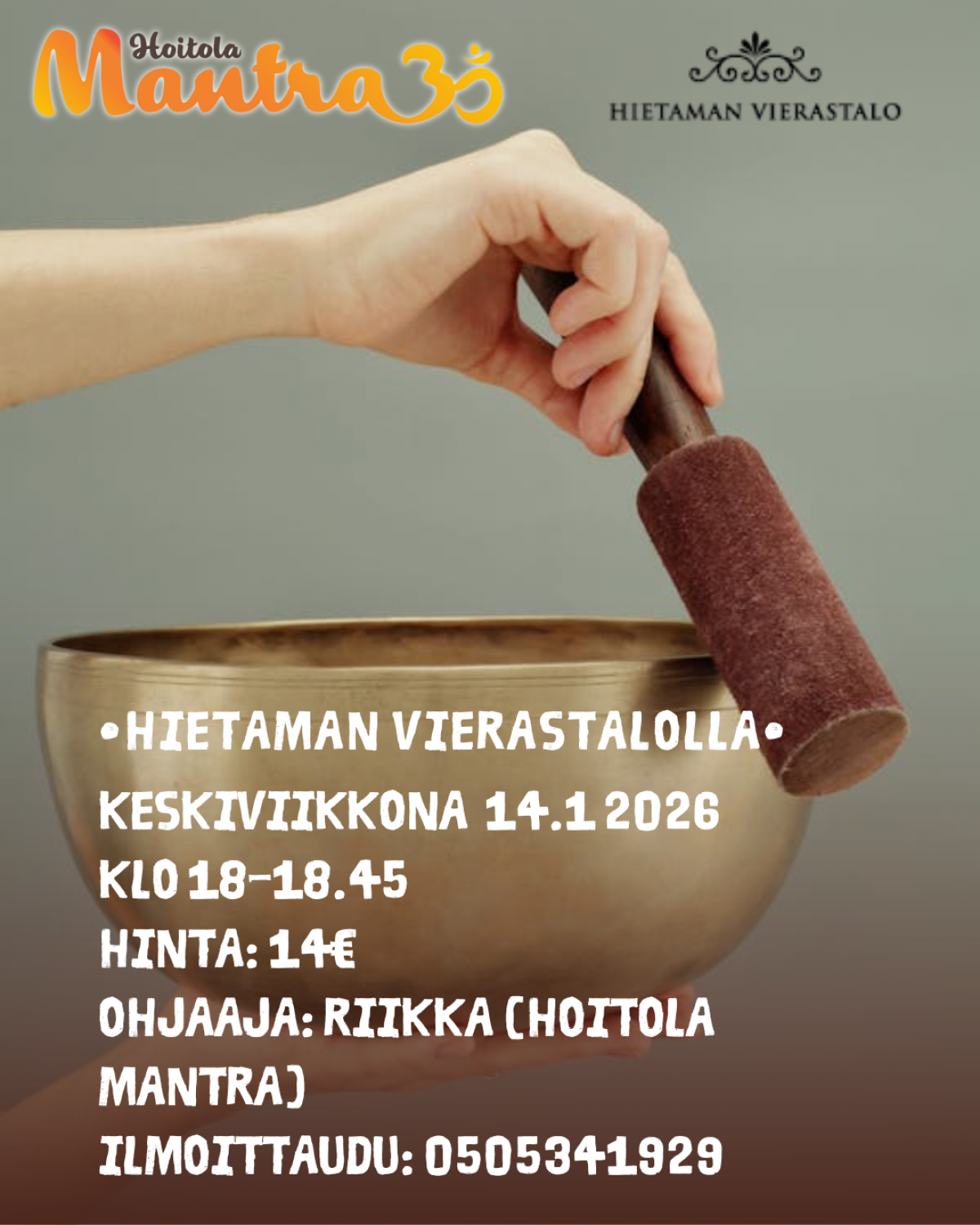 Sitova ilmoittautuminen äänimaljaohjaaja Riikka Hapolle (Hoitola Mantra) 0505341929. Paikkoja rajoitetusti.