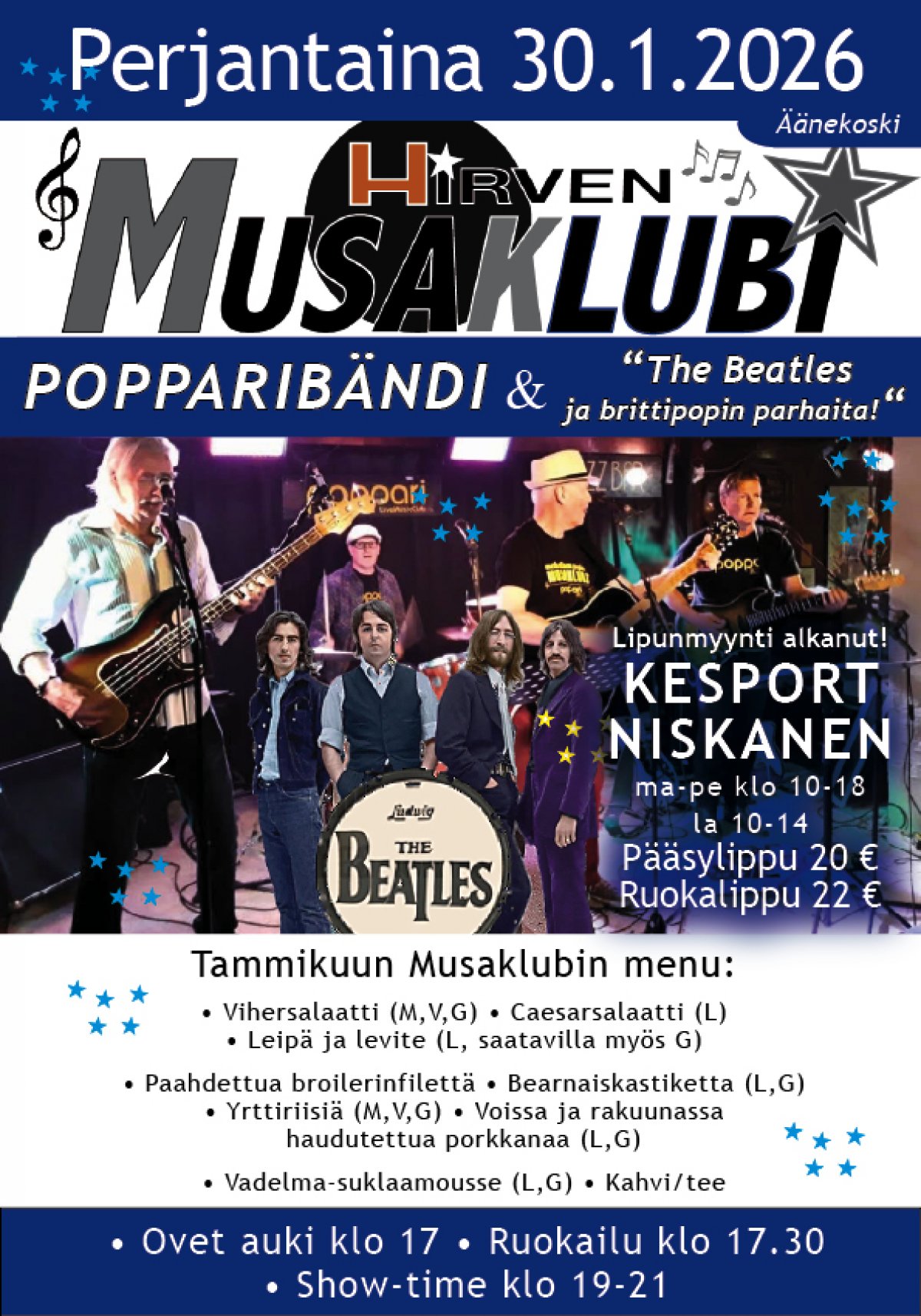Perjantai 30.1. Hotelli Hirvi. 60-, 70- ja 80-lukujen melodisen popmusiikin klubi.