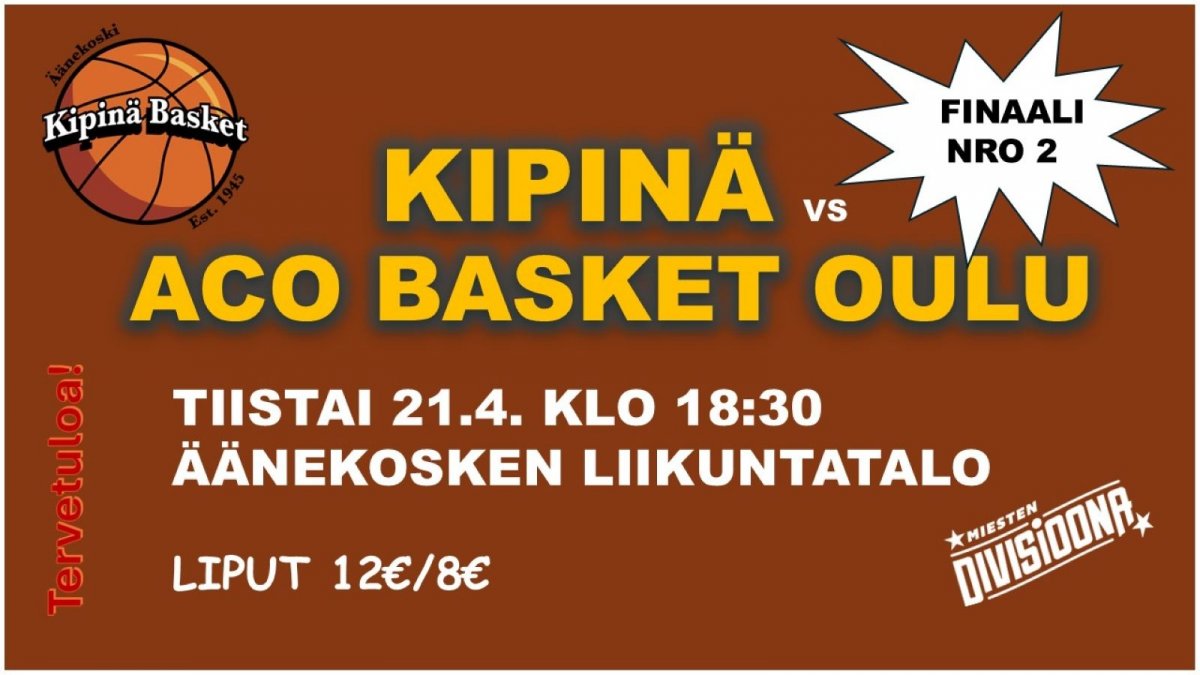 Finaalissa Kipinän miehillä on vastassa runkosarjan voittanut ACO Basket Oulusta. Ensimmäinen finaaliottelu pelattiin lauantaina 18.4. Oulussa. Finaaliottelu nro 2 räjähtää käyntiin Äänekosken Liikuntatalolla tiistaina 21.4. kello 18:30. Tervetuloa Liikuntatalon höyrykattilaan kannustamaan ja katsomaan kovatasoista korista ja kokemaan sen huumaa!